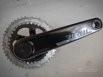 Vendo, per passaggio a gruppo Red, guarnitura Sram Rival 12v con misuratore di potenza Quarq su pedivella sinistra. Corone 48/35, pedivelle 170 mm. Ottime condizioni, normali segni di usura. Sulla copertura di plastica della corona grande sono presenti due cricche che non comportano limitazioni meccaniche, trattasi di difetto estetico trascurabile.