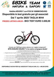 EBIKE HAIBIKE NDURO 7 MOTORE YAMAHA 85NM BATTERIA 720WH TAGLIA M 44 ed L 47 PERFETTAMENTE FUNZIONANTE CONTROLLATA E MANTENUTA REGOLARMENTE Bici test km 300 TAGLIA M 50KM TAGLIA L in uso nei campi scuola E Bike Team utilizzata per attività di formazione e per eventi o tour organizzati. Bici perfettamente funzionante controllata e mantenuta regolarmente. Motore Yamaha PW X3 da 85 Nm con batteria da 720 Wh. Autonomia fino a circa 130 km in base all’utilizzo. Forcella FOX 38 Float Performance Grip con escursione 180 mm e ammortizzatore FOX Float X2 Performance. Trasmissione Shimano SLX 12 velocità con rapporti 10 51. Freni Magura MT5. Ruote 29 anteriore e 27.5 posteriore. La bici viene ceduta con documentazione fiscale e copertura di garanzia attivata al momento dell’acquisto. Dove provarla Per gli associati durante tour e test ufficiali, presso i campi scuola E Bike Team, oppure presso i sponsor tecnici Doctor Bike e Fiuggi E Bike centro assistenza, Bosch, Yamaha, Brose, Fazua, Panasonic, Bafang, DJI, Avinox, Amflow, Atala, Bianchi, Cannondale, Cube, Decathlon, Fantic, Focus, Giant, Haibike, KTM, Lapierre, Megamo, Merida, Mondraker, Orbea, Santa Cruz, Scott, Specialized, Thok, Trek, VanMoof, Whistle