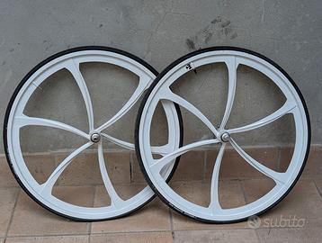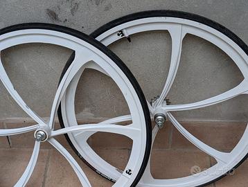 Vendo per inutilizzo kit completo per montaggio bici scatto fisso (manca solo catena per completarla). Il pacchetto include: TELAIO E FORCELLA: In acciaio, colore azzurro, con congiunzioni classiche. Misure standard urban. RUOTE: Coppia di ruote a razze in alluminio bianco, profilo aerodinamico. Già montate con coperture Vittoria Zaffiro Pro in ottimo stato. Nota: i cerchi presentano alcuni graffi estetici da utilizzo (come da foto), ma sono solidi e perfettamente centrati. REGGISELLA SPECIALE: Modello con luce LED rossa integrata nel tubo, alimentato con 2 comuni pile stilo AA. Ideale per la sicurezza urbana. COMPONENTI INCLUSI: Manubrio bullhorn nero, guarnitura nera con corona, sella bianca coordinata e coppia di pedali flat neri. Ottima base per un progetto urban stiloso o per chi cerca una bici da battaglia per la città. Tutto il materiale si trova a Colorno (PR). Prezzo: € 250 (Trattabile per ritiro rapido)