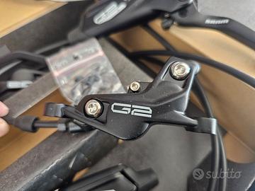 Kit nuovo completo gruppo freni SRAM G2 RSC a quattro pistoncini, compreso di dischi SRAM Centerline 203mm e pastiglie freno. Tutte le componenti (pompe, pinze, dischi, pastiglie, tubazioni) sono assolutamente nuovi e mai utilizzati. Vengono forniti tutte le parti necessarie per il corretto montaggio. Disponibile per spedizione.
