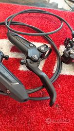 Kit freni nuovi, smontati da bici nuova, SRAM Level Silver Stealth con pinza a due pistoni. Pastiglie organiche. Lunghezza tubi 740mm + 1380mm. Forniamo anche kit di ogive per collegare il tubo posteriore
