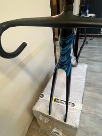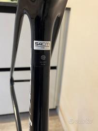 Vendo kit telaio (frameset) Trek Émonda SLR 2021 completo di forcella e cockpit integrato •Carbonio SLR OCLV 800 (top di gamma Trek) •Forcella originale full carbon •Cockpit integrato in carbonio OCLV Bontrager Aeolus RSL VR‑C (post richiamo Trek) Larghezza barra: 40cm Attacco manubrio: 8cm •Movimento centrale CeramicSpeed già installato Taglia: 54 Peso: kg 1,9 telaio + forcella + Cockpit integrato Telaio ultraleggero, rigidissimo progettato per salite. Ideale per montaggi personalizzati o upgrade racing. Condizioni perfette, é presente un adesivo personalizzato sul tubo centrale facilmente rimovibile. Preferibile visione e consegna a mano.