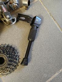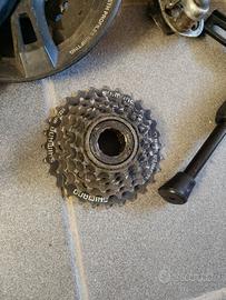 vendo trasmissione completa per MTB da ragazzo, tutto della Shimano: guarnitura tripla con pedali, deragliatore anteriore e posteriore 3*6, comandi cambio tipo revoshift, più cavalletto e "corna" per il manubrio. Tutto quello che si vede nelle foto. prezzo totale del blocco ricambi 15€.