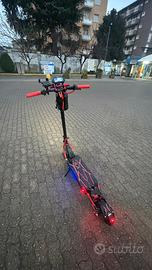 Monopattino personalizzato rosso/nero con vari dettagli custom (molle, parafanghi, copricavi, manopole e logo coordinati).