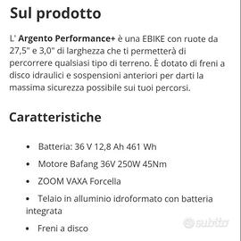 L'Argento Performance+ è una EBIKE con ruote da 27,5" e 3,0" di larghezza che ti permetterà di percorrere qualsiasi tipo di terreno. È dotato di freni a disco idraulici e sospensioni anteriori per darti la massima sicurezza possibile sui tuoi percorsi.