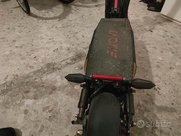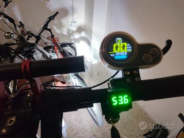 Monopattino ad alte prestazione e molto robusto dal peso di 24/25 kg con una pedana larga da poter mettere entrambi i piedi paralleli. Freni a disco su entrambe le ruote, ho anche la pellicole della pedana nuova da applicare. Migliorie rispetto alla dotazione di fabbrica: antifurto con telecomando, frecce anteriori e posteriori con cicalino acustico intermittente, chiave di accensione con controllo amperaggio batteria, luci aggiuntive frontali, poggia piede posteriore. Inoltre per avere maggiore percorrenza é montata una batteria da 26 che consente di percorrere 70 km a velocità sostenuta mentre 90 km rimanendo nei 20 km/h. Con il display si possono impostare diverse funzioni dal Cruise control alle 3 velocità etc.....