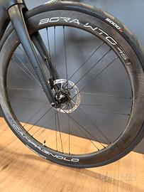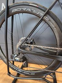 Telaio: Nuovo Freccia carbon fili integrati Forcella: carbonio Gruppo: Nuovo Sram Rival elettronico Ingranaggi: 48/35 + 10/30 - pedivelle 170mm Ruote: Campagnolo Bora Wto 45mm Piega: aero palmata alluminio Coperture: Gp Continental 5000 Nuovi 700x28 Sella: Selle Italia Portaborracce: 2 Elite Peso: 8,1 kg