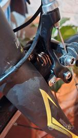 forcella in carbonio, piega manubrio carbonio, gruppo completo Campagnolo Veloce 10v meccanico. Ruote Mavic Aksium con raggi piatti. Allego foto di piccoli difetti, un graffio sulla sella, qualche vite o parte del freno arrugginita, diciamo che in generale la bici deve fare una revisione ma funziona tutto perfettamente, non ci sono parti danneggiate o non funzionanti.