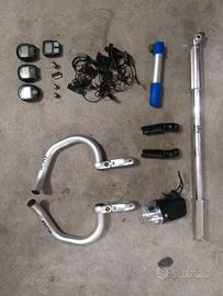 Altri componenti: 1 sella corsa SMP Glider, 4 contachilometri, 2 prolunghe manubrio corsa, 2 prolunghe manubrio flat, 1 fanale ant. da manubrio, 2 pompe di gonfiaggio, 4 borracce, 4 portaborracce, 2 gomme stradali 28-622 seminuove.