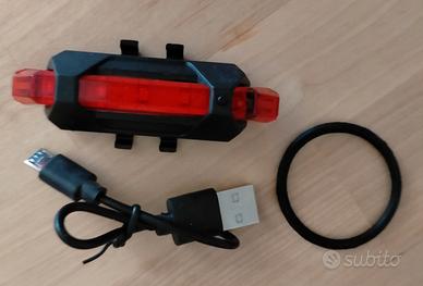 Luce posteriore rossa a LED ricaricabile tramite cavo USB con anello in gomma elastica per fissaggio al tubolare.