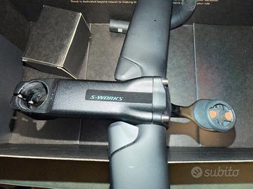 Vendo 1) manubrio Rapide in carbonio soecialized molto confortevole grazie ad una superficie lavorata che regala un ottimo grip anche quando è bagnato, ed il profilo fornisce ampio spazio per gli avambracci e le ginocchia. Con un peso di soli 225 grammi, il manubrio Rapide è il più leggero nella sua categoria. Prestazioni aerodinamiche senza compromessi. Realizzato in fibre di carbonio ad alto modulo ed un peso di soli 225 g (mis. 42 cm) Superficie lavorata Larghezza (centro-centro) 42 cm. 125mm drop x 75mm reach 2) attacco manubrio S-Works Tarmac con piastrina con l'integrazione di un montaggio per ciclocomputer. Compatibile con il cockpit integrato Tarmac Lunghezza 110mm Inclinazione verso l'alto 6 gradi Peso indicativo 155 g (100mm) Il tutto usato poco per passaggio a manubrio integrato. Il prezzo dei due componenti supera di listino i 450 euro. Vendo in blocco