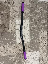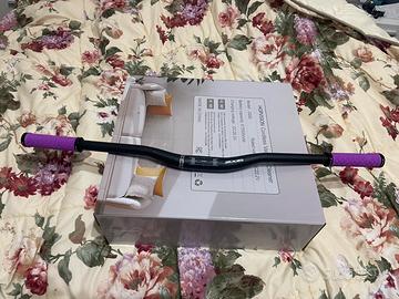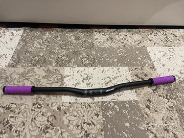 Manubrio per bicicletta marca Zoom, colore nero opaco, completo di manopole ergonomiche viola già montate.