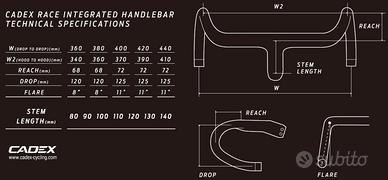 Con soli 256 grammi per un prodotto in taglia 420mm x 100mm, il manubrio integrato CADEX Race è costruito appositamente per lunghe scalate in cui ogni grammo e comfort contano. Un reach di 72 mm e un drops di 125 mm rendono i cambi di presa lisci e naturali, e un flare di 11 gradi aumenta il controllo. Il passaggio dei cavi interno pulisce il cockpit e migliora l'aerodinamica.