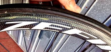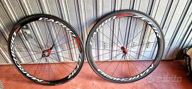 Vendo coppia di ruote Marchisio Zephir in carbonio profilo medio alto ,tubolari tufo s33 inclusi.i cerchi sono dritti. quello anteriore è perfetto,nessun difetto. il posteriore invece nella pista frenante riporta il danno in foto.non mi sono mai informato se si potesse riparare o nell'eventualità poter applicare una pista frenante sopra al carbonio stesso. I cerchi vengono venduti così come in foto completi di ganci.ruote leggerissime.possibilità di spedizione