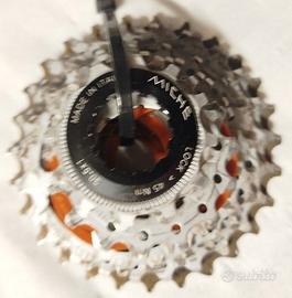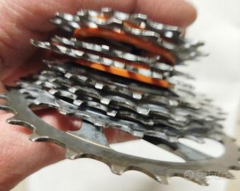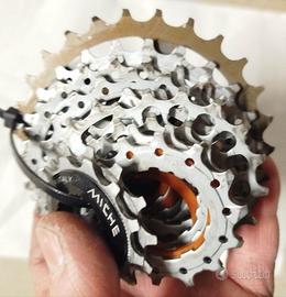 Miche cassetta leggera compatibili per il gruppo Shimano e Sram ad 11 velocità. Rapporti 11-27 pignoni cassetta: 11-12-13-14-15-17-19-21-23-25-27 peso circa 163g. condizioni buone vedi fori reali .