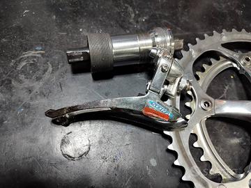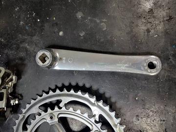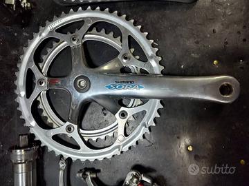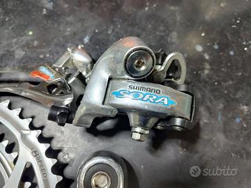 Mini gruppo Shimano Sora 8V. smontato da bici nuova mai usato qualche piccolo segno di magazzino.Il gruppo è composto da guarnitura con corone 52/39 e 170 mm. di lunghezza,movimento centrale filetto Italiano,cambio,deragliatore e freni.