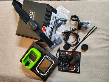 Dispositivo (compiuter), Guscio protettivo in silicone, base di fissaggio al manubrio, Staffa di fissaggio al manubrio, 2 sensori mai montati, un Cavo di collegamento al PC, un Caricabatteria, una Fascia cardio che non garantico la funzionalità perchè non la uso da molto tempo...