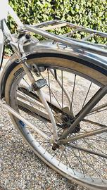 Bicicletta pieghevole Mirella Leri. marciante, con: -luci a dinamo, -due porta pacchi (anteriore e posteriore), -blocca raggi, -sellino con molle, -ruota da 24. Tutta originale a parte i copertoni e le camere d'aria. segni di ruggine superficiale. la dinamo o le lampadine non funzionano.