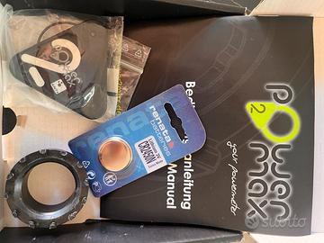 Vendo misuratore di potenza power2max compatibile con guarniture Rotor, completo di chiave per il montaggio, perfettamente funzionante con batteria di ricambio nuova e coperchio batteria nuovo, girobulloni 110.
