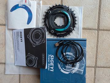 Misuratore di potenza Sigey. Perfetto usato su MTB circa 2000 km (1 anno). Bilanciamento potenza sia destra che sinistra, cadenza di pedalata ecc ecc. Super robusto. Carica infinita. Completo di scatola originale e tutti gli accessori, caricatore magnetico, adesivi per cambiare colore esterno, vendo montato su corona 32T Garbaruk quasi nuova e bulloneria carbonTi. Scontrino visionabile. Leggermente trattabile.