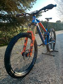 MTB Mondraker Dune 27.5" taglia S, equipaggiata con telaio in alluminio con doppia sospensione e 160 mm di escursione. Forcella Fox 36 Factory, mono RockShox Monarch, freni shimano slx, trasmissione Sram 11V, ruote Race Face Arc30, pedali Flat, reggisella telescopico Bontrager. Mtb usata con normali segni di usura, sempre manutentata, Sospensioni revisionate, ruote tubeless con mousse piu ruota completa da 26 per versione Mullet.