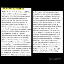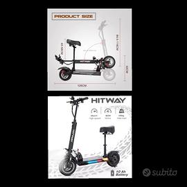 Monopattino Hitway H5 45 km/h velocità max, percorrenza 40km, ha percorso solo 359km come da foto , dispongo di imballi originali. DESCRIZIONE APPROFONDITA IN FOTO . Una vera bestiolina di velocità e potenza , dispone di freno a disco anteriore , a tamburo posteriore , indicatori di direzione sonori, clacson , luce , stop luce in diffusione ecc. Ottime condizioni . La sella è smontabile ed è tutto totalmente pieghevole