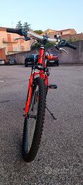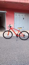 Vendo mountain bike con telaio in acciaio, forcella ammortizzata anteriore, ruote da 26” con copertoni tassellati, cambio Shimano 18 velocità, freni V-brake, cavalletto incluso. Sella sportiva bicolore, bici pronta all’uso e ideale per città e sterrato leggero.