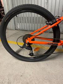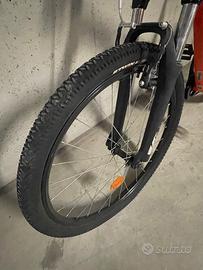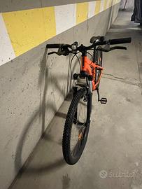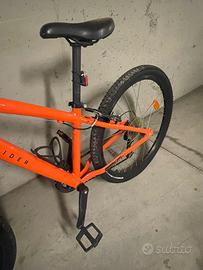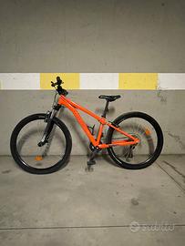 Bici Mtb Rockrider (Decathlon) bambino 9-12anni EXPL 500 arancione ruote da 26 pollici. Usata 3 volte, tenuta benissimo, telaio in alluminio, cambio mono corona da 34 denti e 7 velocità, comando sul manubrio, sospensione anteriore. Lunghezza 168 cm, altezza 100 cm, larghezza 60 cm.