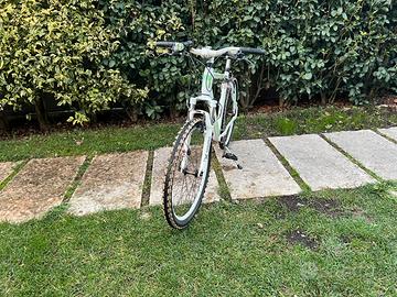 Causa inutilizzo, vendo mountain bike in ottime condizioni, telaio in alluminio bianco/verde, con forcella ammortizzata anteriore, cambio Shimano a più velocità e freni V-Brake. La bici è leggera, comoda e perfetta per uscite su strada o sterrato leggero. Pneumatici e componenti in buono stato, pronta per essere usata. Ideale per uso quotidiano o tempo libero.