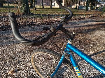 Mountain bike in ottime condizioni, gomme nuove, tre corone anteriori (29, 39,49) 7 posteriori (dal 13 al 29), colore azzurro metallizzato, corna di bue molto estese ottime per spingere a passo costante anche sul piano, vendo causa inutilizzo, cambio Shimano, ha solo bisogno di spolverata e di pulizia delle corone
