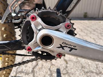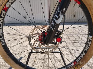 Bicicletta taglia S, con ruote da 26". Configurata cross country, ma utilizzabile anche per enduro, dirt. Sospensioni fox 32mm anteriore con escursione 150mm e fox posteriore con escursione 130mm. Trasmissione e cambio Deore XT con doppia corona anteriore e cassetta 9 velocità al posteriore. Freni formula R1 idraulici con dischi diametro 180mm.