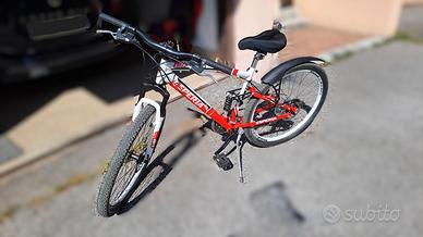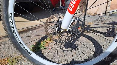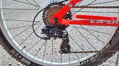 Vendo bellissima Mountain Bike Esperia modello Dominator 650B, ideale per chi cerca una bici robusta, versatile e pronta all'uso. Perfetta sia per percorsi sterrati che per spostamenti urbani grazie al suo sistema di doppia ammortizzazione che garantisce il massimo comfort su ogni terreno. Caratteristiche Principali: Telaio: Full Suspension (Biammortizzata) con ammortizzatore posteriore regolabile. Ruote: 27,5 pollici (650B) con cerchi in alluminio a profilo bianco. Pneumatici: Vee Rubber 27.5 x 2.10 in ottimo stato, con battistrada ancora molto profondo. Freni: Sistema frenante a disco meccanico (anteriore e posteriore) per una frenata sicura anche sul bagnato. Cambio: Shimano a 21 velocità con comandi a manubrio precisi. Forcella: Anteriore ammortizzata per assorbire al meglio le asperità del terreno. Accessori Inclusi: Parafango posteriore sportivo. Coprisella imbottito in gel per un comfort extra durante le lunghe uscite. Cavalletto laterale robusto. Pedali flat resistenti. Vendo per inutilizzo. Prezzo leggermente trattabile. Solo ritiro a mano zona Paese.
