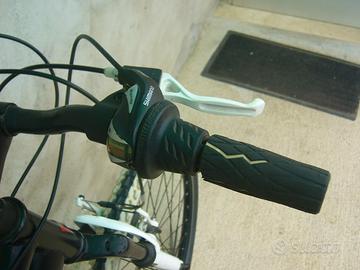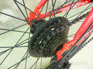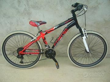 Bicicletta montain bike marchio FRERA per ragazzo , telaio in acciaio con ruote da 24” in lega, forcella Zoom ammortizzata, cambio Shimano Revoshift SiS 42T a 3 rapporti alla corona dei pedali e 6 rapporti alla ruota, portaborraccia, cavalletta.