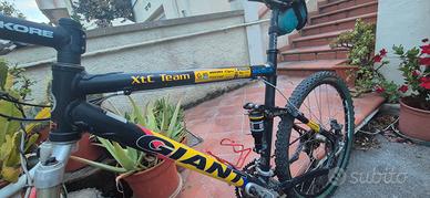Vendo per inutilizzo mountain bike del 2002 Giant XtC Team biammortizzata con forcella ant. ed ammortizzatore post. Rock Shox Sid; 2 freni a disco e cambio shimano xt a 9 velocità. Ruote da 26'. Usata poco in buone condizioni, mai incidentata. Per amatori, prezzo tratt.