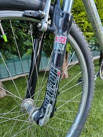 MTB Mountain Bike marca Irok 2001 con telaio ir alluminio customizzata con sostituzione dell'oriainale forcella con ammortizzatore Pilot Catena, cavi e quaine freni, moltiplica e rapport nuovi. Copertoni fuoristrada FINCCI sostituiti un paio di mesi fa. Nuove manopole ergonomiche in gomma antiscivolo. Freni a tamburo, ruote diametro 26 con sqancio rapido. I1 telaio presenta normal segni di usura e come misura è una L. MBT con 7 rapporti e 3 moltipliche. Non spedisco, consegna a Ravenna.
