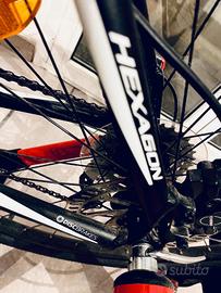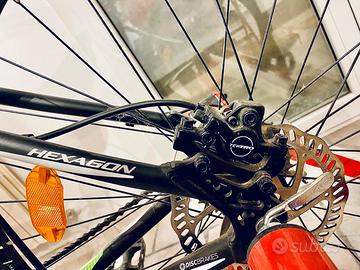 MTB KROSS R6 Hexagon 27,5 TG M Front Cambio Shimano 1. Telaio in alluminio idroformato M19” 2. Ammortizzatore anteriore regolabile e bloccabile SR Suntour XCT 3. Trasmissione shimano: deragliatore anteriore Tourney , posteriore alivio 8V, cassetta shimano CG31-8, guarnitura SR Sountour, manetti shimano. 4. Freni idraulici Tek Tro 5. Cerchi doppia parete 584x19 6. Pedali in alluminio 7. Manubrio oversize 8. Doppio sgancio rapido 9. Porta borraccia in tinta Elite Customrace 10. Porta cellulare e porta accessori da manubrio