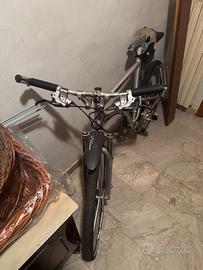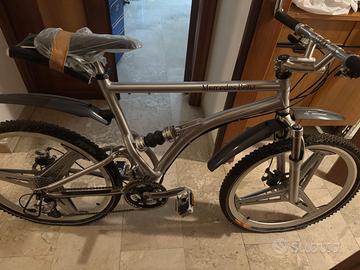 Vendo questo modello vintage di Mercedes-Benz MTB Pieghevole (spesso chiamata "Folding Mountain Bike") risalente all'incirca al 2002. Il design curvo del telaio in alluminio è studiato per essere ripiegato, rendendola compatta per il trasporto. La bici è biammortizzata, con una forcella anteriore ammortizzata e un ammortizzatore posteriore centrale sotto il tubo superiore. Il sistema Shimano offre 27 rapporti di trasmissione. Shimano fornisce anche i freni a disco e la trasmissione completa per la mountain bike. Una delle caratteristiche estetiche più iconiche sono le ruote in lega stellate a tre punte. Sono presenti i manuali di istruzione ma non sono sicuro di avere la sacca originale mercedes per il trasporto. Non è mai stata utilizzata, solo le ruote sono un pò sporche e sgonfie. Prezzo trattatbile.