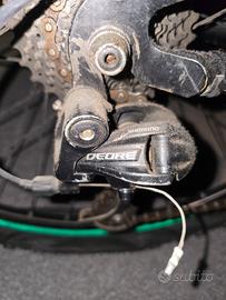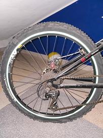 Vendo per inutilizzo, mtb misura 26 telaio rockrider. La bici monta queste modifiche rispetto all'originale: -copertoni Michelin Country All Terrain con 50km di uso -cambio Shimano Deore a 8 velocità -leve pedali Shimano Alivio con pedali removibili a sgancio rapido -freno a disco posteriore ed anteriore con potenza regolabile -tubo sella Funn e sella Vader -manubrio Tioga Riser R30 in alluminio -cerchione posteriore Mavic Xm119 Disc (per installare il freno a disco posteriore che non era presente di serie) inoltre l'unica modifica estetica sono i raggi del cerchione anteriore colorati e delle strisce catarifrangenti in entrambi i cerchioni da entrambi i lati. La bicicletta è ferma da 6 anni, non fuori ma dentro la mia stanza quindi non esposta ad intemperie. Di conseguenza è chiaro che comunque necessita di manutenzione quale regolazione cambio, grasso catena e controllo copertoni che hanno la camera d'aria.