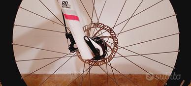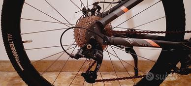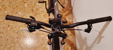 Vendo la MTB in foto, ruote 27,5 misura M Telaio 100% alluminio. Peso 15,2 Kg Monocorona anteriore e 9 corone posteriori da 11 a 34 denti. Freni a disco meccanici da 160 mm Forcella regolabile per pesi da 55 Kg a 105 Kg. Pneumatici ALL TERRAIN. Porta cellulare. Cavalletto. Casco MTB nero nuovo in regalo. Appena sostituiti, nuovi, leveraggi freni, manopole e porta borraccia (ultima foto) Ritiro a Brindisi città. NON SCAMBIO, NO TRATTABILE. Solo contatti telefonici in voce, no messaggi.