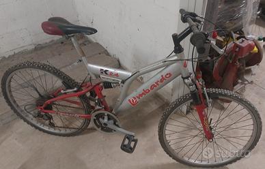 Mountain Bike con un telaio con ammortizzatori sia anteriori che posteriori. Il design color grigio con componenti rossi. Misura ruote 26