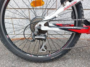 Mountain bike Shockblaze bambino/ragazzo taglia S (comoda fino a 155cm di altezza); cambio Shimano Acera 7v posteriore (3v anteriore) con indicatori numerici al manubrio, forcella anteriore con blocco/sblocco e regolazione del precarico, gomme nuove.