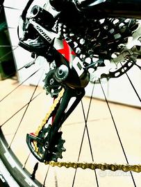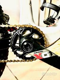 Completamente al carbonio, cerchi, telaio, manubrio, con cambio sram X0 - 12V monocorona.