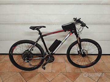 Mountain bike elettrica adatta per off-road, sentieri sterrati o strada. Ha un motore rear-hub da 250w, batteria 36v 8ah, ruote da 27,5", cambio a 9 marce e freni idraulici Shimano, schermo wireless rimovibile, assistenza a 5 marce, forcella bloccabile. Tenuta in ottime condizioni.