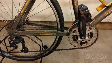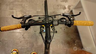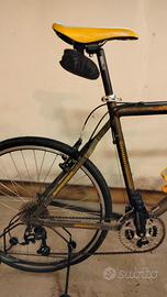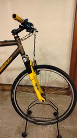 mountain bike vintage Wilier Triestina con ruote da 26 pollici e forcella ammortizzata gialla. Usata molto poco. Essendo ferma probabilmente i copertoni vanno cambiati. Caratteristiche principali della bici: Marca:Wilier Triestina, nota azienda italiana specializzata in biciclette da corsa e MTB. Componenti:È equipaggiata con un gruppo cambioShimano Deore XT(visibile sul deragliatore posteriore), uno dei sistemi più affidabili per le MTB vintage. Telaio:Presenta una colorazione scura con decalcomanie dorate "Wilier" sul tubo obliquo. Sospensione:Dotata di una forcella anteriore ammortizzata