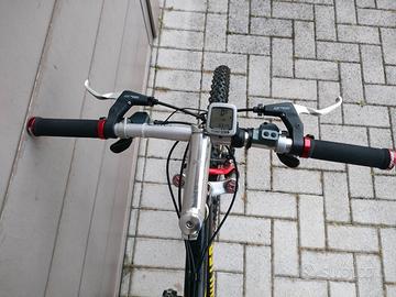 Vendo bicicletta mountain bike Wilier in ottimo stato con ammortizzatori rock shox. Telaio in alluminio. Gruppo di trasmissione (cambio posteriore, deragliatore anteriore, comandi cambio, freni, guarnitura, pacco pignoni, catena) originali Shimano Deore XT, freni XT Deore, ruote da 26’’. Pacco pignoni da 9 rapporti e 3 corone. Contachilometri con visualizzazione del rapporto in uso. Sella Shock blaze al gel. E’ presente l’attacco garmin.