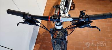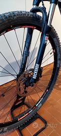 Mountain Bike Shockblaze R seven, ruote 29", 30 rapporti, forcella anteriore ammortizzata con tasto di blocco rapido a manubrio, freni a disco. Appoggio su cavalletto per salvaguardare le ruote.