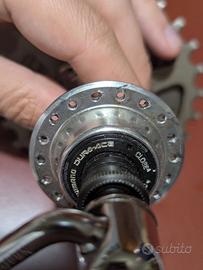 Mozzo anteriore e posteriore con 6 pignoni (dal 16 al 26) marca Shimano Dura-Ace, il mozzo anteriore mai usato.