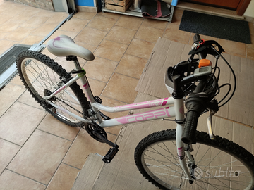Usata poche volte, revisionata in tutto, come nuova. MTB donna Jaunty da 26", 18 v, acciaio coppi, freni V brake, cambio Shimano Tz50 18v. Modello CMD 26218B. Presenta alcuni graffi sul telaio ( vedere foto 6). Completa di cavalletto, luci anteriori e posteriori, contachilometri. Adatta a ragazza o al massimo per una persona alta 1,60m. Regalo caschetto nuovo. Vero affare!!