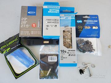 Regalo ricambi NUOVI in foto: movimento Centrale Shimano, catena Shimano XT, 2 coppie falsamaglie KMC, guida cavi. coppia levette con anima di metallo, valvola tubeless Mavic, camera d'aria, strumento arretramentopistoncini freno, minuteria varia