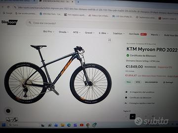 MTB 29 MARCA KTM MODELLO MYR0ON PRO CARBONIO TELAIO MISURA M COMPRESO PELLICOLA PROTETTIVA SU TUTTO IL TELAIO + CAMBIO SHIMANO DEORE 12X1 + FRENI SHIMANO IDRAULICI MAGGIORATI DISCO POSTERIORE 180 ANTERIORE DISCO 220 + FORCELLA ROCKSHOX SID CON 2 FASI CON LEVA AL MANUBRIO CON BLOCCO REMOTO +MANUBRIO INTEGRALE SYNCROOS IN CARBONIO + REGISELLA TELESCOPICO+ PEDALI FLAT MARCA SHIMANO + MTB COME ACCESSORI SONO STATI SPESI 1200 EURO + VALORE DELLA MTB 1490 VALORE DELLA MTB 2690 LA MTB SI PUO DIRE PARI AL NUOVO CON LIBRETTO KTM + BORSA KTM USATA POCHISSIMO SOLO X PASSEGGIO SI PUO DIRE PARI AL NUOVO CHIEDO 1300 EURO NON TRATTABILE SEMPRE DISPONIBILE